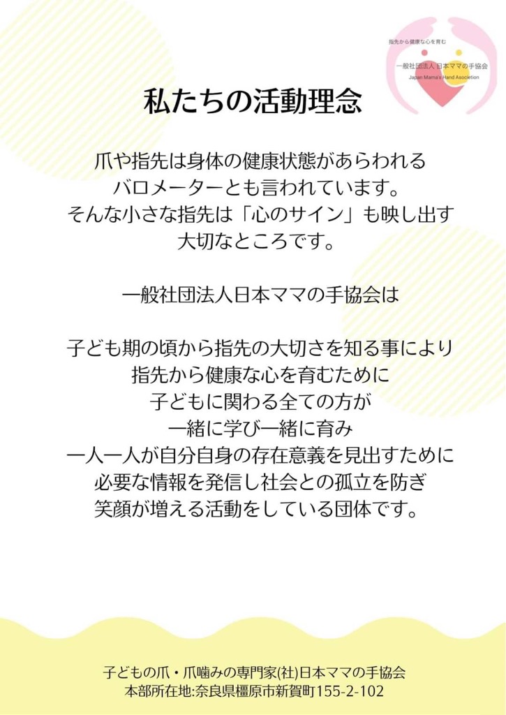 “子どもの爪専門 ママの手サロン”では子どもの爪・指先を通して成長期に必要な栄養・姿勢ケア・足育など多方面からアドバイスができます。